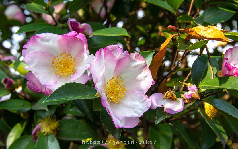 Fiche de culture de Camellia sasanqua 'Versicolor'. Réussir à planter, cultiver et entretenir Camellia sasanqua 'Versicolor' au jardin.